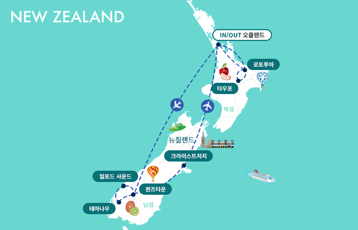 인천-나리타/기내박(1)-오클랜드-로토루아(2)-오클랜드(1)-퀸즈타운/테아나우(1)-밀포드사운드/퀸즈타운(1)-크라이스트처치/오클랜드(1)-나리타-인천